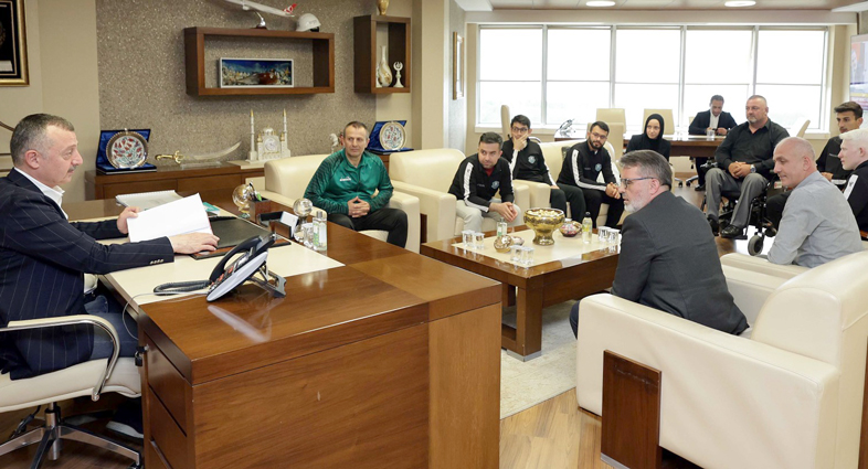 Engellilerin topluma katılımı ve entegrasyonuna dönük sportif etkinliklerinin özel bireylerin arasında sporcu ruhuyla birlikte özgüvenlilerine katkı olduğunun altı çizilen görüşmede Başkan Büyükakın, “Büyükşehir Belediyesi olarak engelli bireylerimizin yaşama sevincine ve gücüne inanıyoruz. Bu nedenle şunu çok iyi biliyoruz, engelli bireylerimiz sporla sınırlarını zorluyor. Sınırlarını zorlayan, yaşama sevincini büyüten çocuklarımıza ve gençlerimize destek olmayı bir görev olarak görüyoruz. Ziyaretiniz nedeniyle engellerini kıran ve sporla özgürleşen tüm yavrularımıza teşekkür ediyorum. Hiç merak etmesinler yanlarında Büyükşehir Belediyesi var. Spor yapmak bir tutkudur. Bu tutkuyu büyüten, fiziksel engellerini yenmek için adım atan ve bu tutkuya destek olan herkese bir kez daha teşekkür ediyorum. Elde edilen sportif başarı içinde sizleri tebrik ediyorum” dedi. Birliktelik yapılan görüş alışverişinin ardından sona erdi.