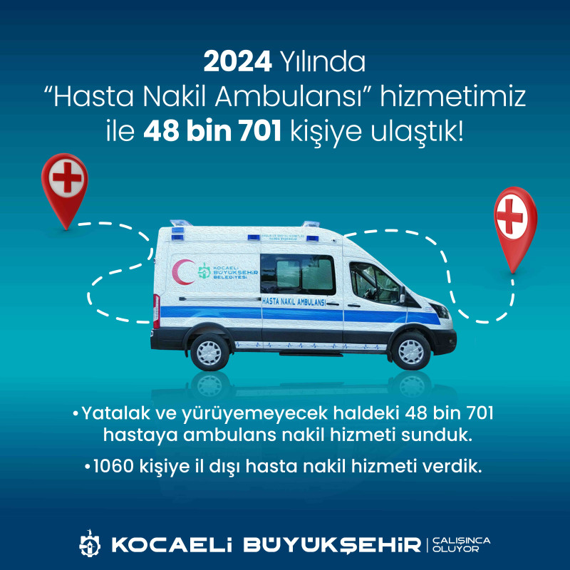 2024 yılında yatalak ve yürüyemeyecek haldeki 48 bin 701 hastaya ambulans nakil hizmeti sunuldu. 30 mavi ambulansın hizmet verdiği çalışmada, hasta vatandaşların evlerinden alınıp sağlık kuruluşlarına, tedavileri bitince yine evlerine ulaştırılması sağlandı. Hasta vatandaşların ve yakınlarının büyük memnuniyetini kazanan örnek çalışma Kocaeli’nin genelinde yürütüldü.