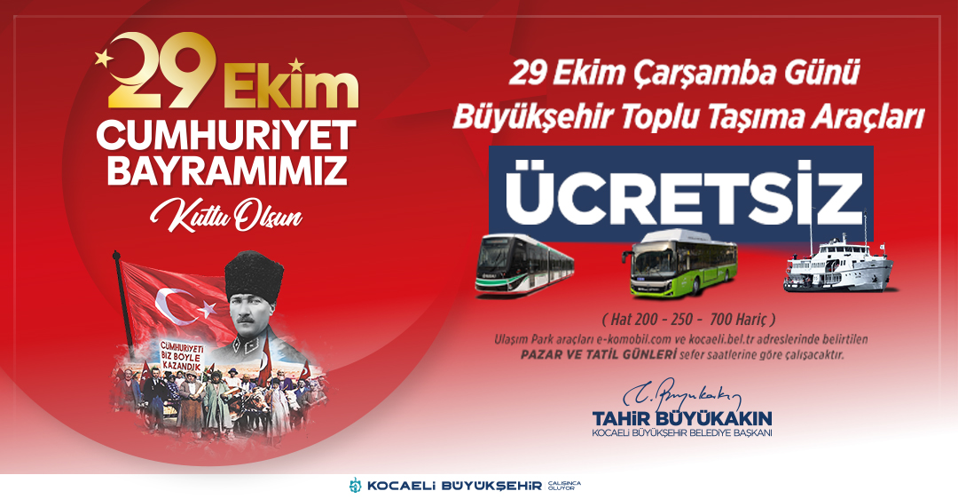Kocaeli Büyükşehir Belediyesi, Cumhuriyet Bayramı kutlama ve etkinliklerinin coşkulu kalabalıklarla yapılabilmesi amacıyla toplu taşıma araçlarının 29 Ekim Çarşamba günü (yarın) ücretsiz olacağını duyurdu.