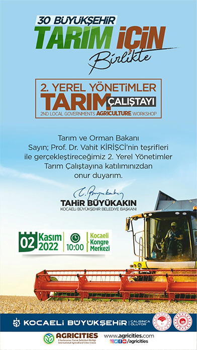 Tarıma yönelik çiftçilerin yüzünü güldüren projelerle Türkiye’ye örnek olan Kocaeli Büyükşehir Belediyesi’nin ev sahipliğinde, 30 Büyükşehir Belediyesi, belediyelerin Tarımsal ve Kırsal Hizmetler Dairesi yöneticileri, yerel yönetim temsilcileri, özel sektör yatırımcıları, çiftçiler ve akademisyenlerin katılımıyla “30 Büyükşehir, tarım için birlikte” sloganıyla, “Yerel Yönetimler ve Tarım Çalıştayı, 2-4 Kasım tarihinde Kocaeli Kongre Merkezinde düzenlenecek.