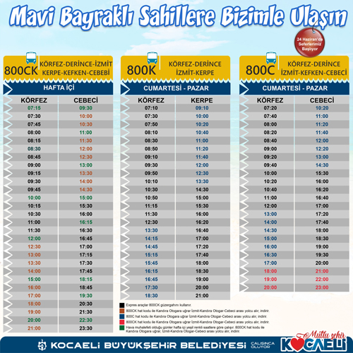24 Haziran Cumartesi günü ilk seferini yapacak olan 800CK gün içinde toplamda 16 araç ile 56 sefer gerçekleştirecek. Körfez’den hareket edecek 800CK; Derince, İzmit, Kerpe, Kumcağız ve Cebeci’ye ulaşım sağlayacak. 800CK Körfez’den ilk seferini saat 07.15’de, Cebeci’den ise son seferini 23.30’da gerçekleştirecek.