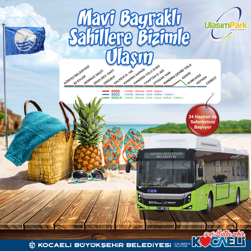 Kocaeli Büyükşehir Belediyesi iştiraklerinden UlaşımPark, bu yıl da vatandaşları Mavi Bayraklı sahillere ulaştıracak. 24 Haziran cumartesi günü (yarın) ilk seferini gerçekleştirecek otobüsler yaz mevsimi süresince seferlerine devam edecek. Ayrıntılı saat ve güzergâh bilgileri www.kocaeli.bel.tr, www.e-komobil.com ve www.ulasimpark.com.tr adreslerinden öğrenilebilecek.