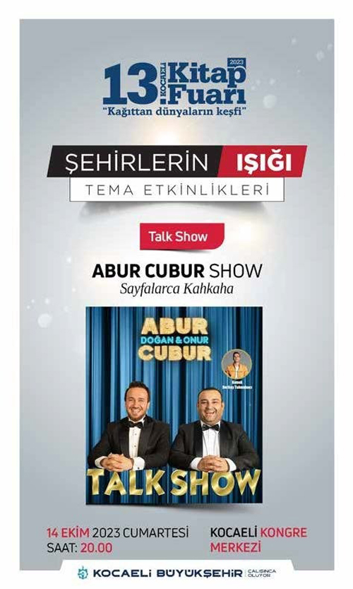 13. Kocaeli Kitap Fuarı’nın 8. gününde BKM mutfak oyuncularından Onur Atilla ile televizyonlardan ve sosyal medyadan tanıdığımız Doğan Akdoğan, birlikte sundukları “Abur Cubur Show” ile 13. Kocaeli Kitap Fuarı’nda izleyici karşısına çıkıyor. Atilla ile Akdoğan’ın birlikte hazırladıkları “Abur Cubur Talk Show”, 14 Ekim Cumartesi günü (bu akşam) Kocaeli Kongre Merkezi’nde sahnelenecek.