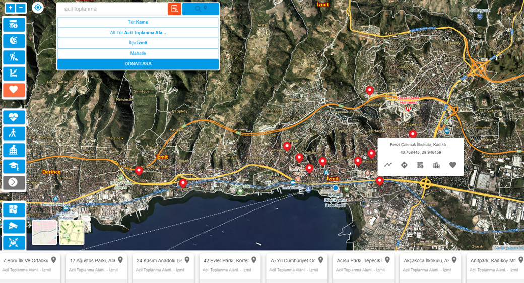 Kocaeli Büyükşehir Belediyesi sürecin daha hızlı ilerleyebilmesi için yeni bir çalışma yaptı. Olası afet durumlarında vatandaşların toplanması gereken Acil Toplanma Alanlarının konumu web tabanlı Şehir Rehberi ve e-Kocaeli mobil uygulamasına yüklendi. Vatandaşlar, il genelinde yer alan 338 adet Acil Toplanma Alanını konumsal olarak uygulama üzerinden görebiliyor.