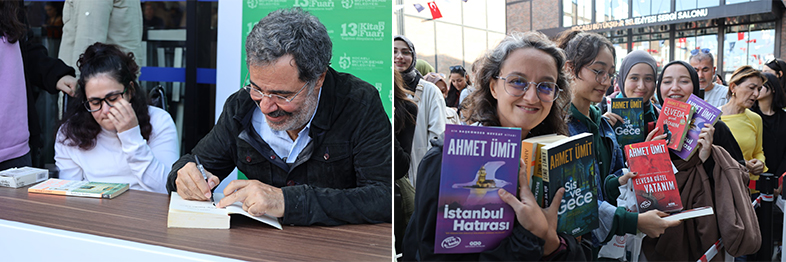 “Yazdığım şeye inanmazsam siz de inanmazsınız” diyerek sözlerine devam eden Ümit,”Romanlarımı yazarken tehlike olduğunda korkuyorum. Mutlu olduğunda tebessüm ediyorum. Bana sorarlar edebiyat neyi anlatır diye. Bir şiir, roman okursanız ne alırsınız diye. Edebiyat insanın ruhunu açığa çıkarır. Âşık olduğumuz zaman o ruhumuz sıradan birini alır büyük biri yapar. Yani aşk aslında hepimizi sanatçı yapar. Bir insandan romanlar yazarsınız. Sizi filozof yapar” dedi. Ahmet Ümit söyleşisinin ardından okurları için kitaplarını imzaladı.