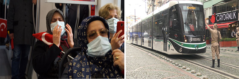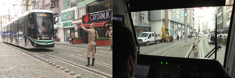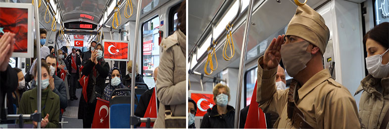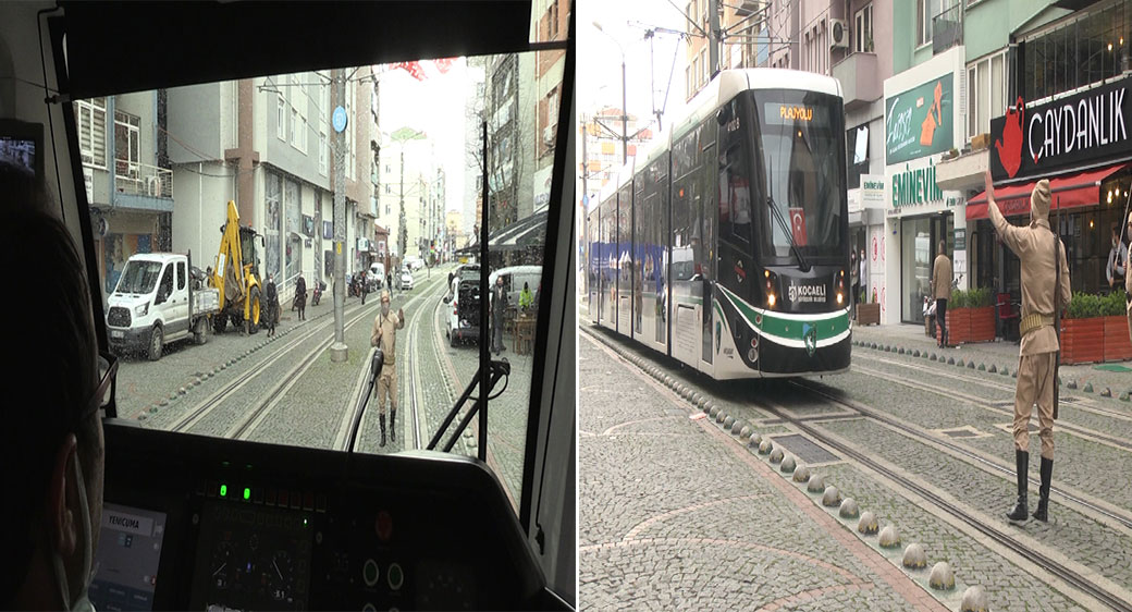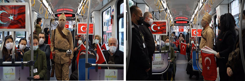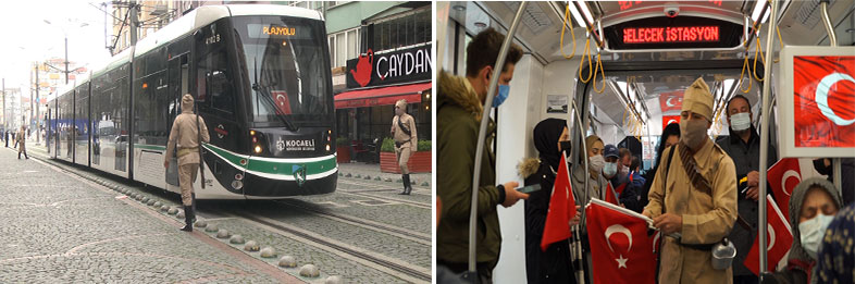 Kocaeli’deki tramvay duraklarının isimleri değiştirilirken Çanakkale Savaşı’nın kahraman askerlerini temsil eden tiyatrocular, tramvayın önünü keserek yolculara, “Dur Yolcu” dedi.