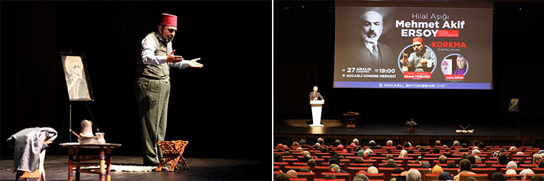Protokol konuşmalarının ardından sinema ve tiyatro oyuncu Ahmet Yenilmez’in İstiklal Marşı şairi Mehmet Akif Ersoy’un hayatını anlatan tek kişilik oyunu “Korkma” sahnelendi. Sanatçı Yenilmez, tek kişilik ve tek perdelik oyunda muhteşem bir performans sergiledi. Sanatçının başarısı izleyiciler tarafından dakikalarca ayakta alkışlandı. Başkan Büyükakın da sahneye gelerek başarısı ve anlamlı geceye katılım için sanatçı Ahmet Yenilmez’e teşekkür ederek, çiçek takdim etti.