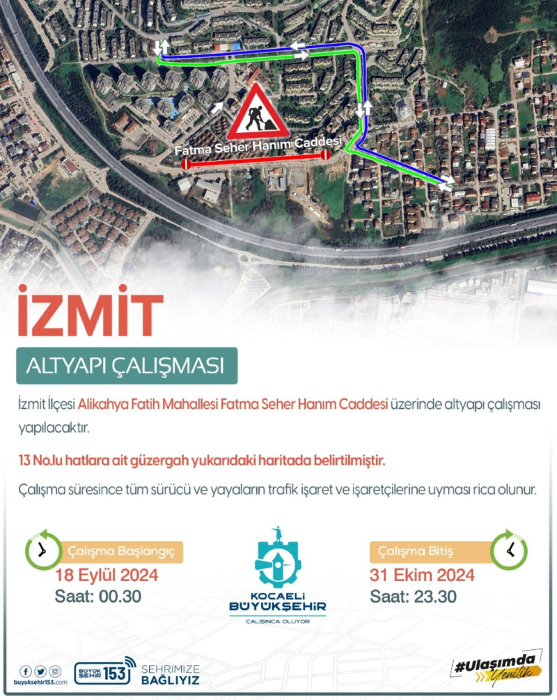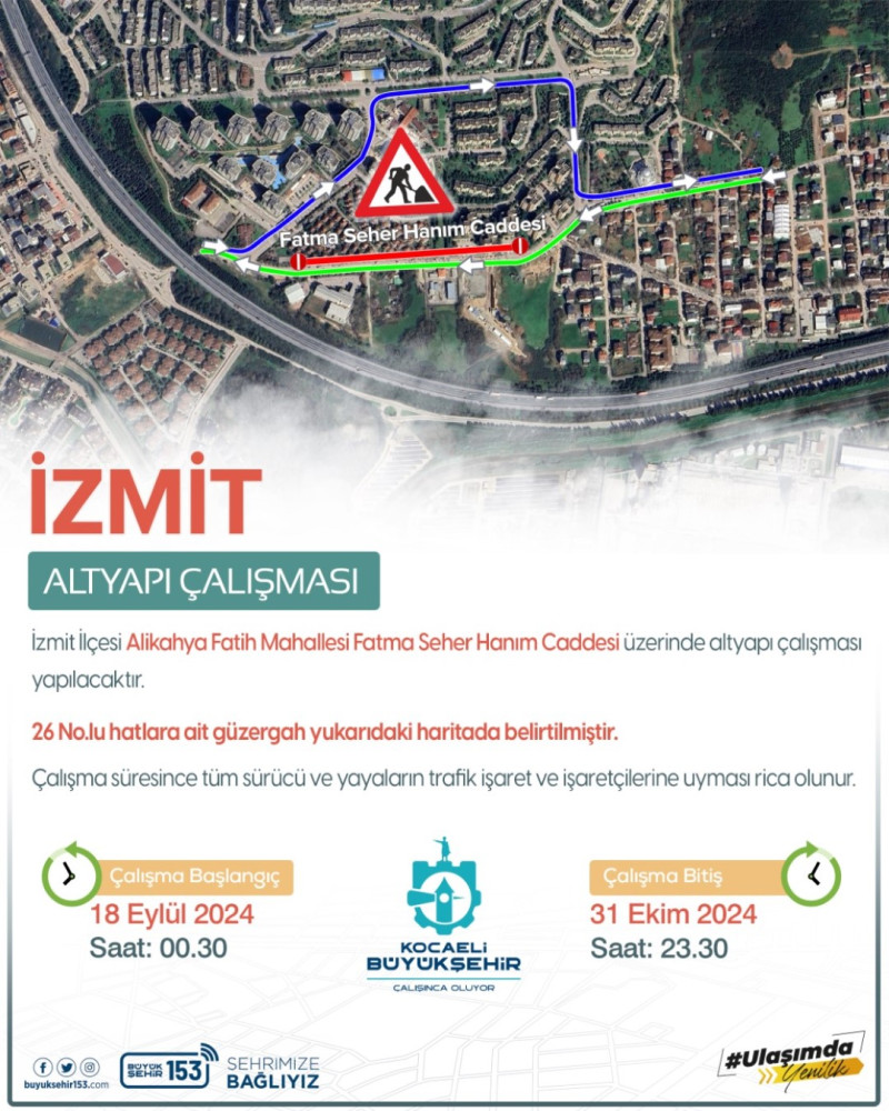 İzmit Alikahya tramvay hattı yapım işi kapsamında Fatma Seher Hanım Caddesi üzerinde altyapı imalat çalışması nedeniyle trafik akışı otogar istikametine tek yöne çevrildi. Fatma Seher Hanım Caddesi üzerinden Alikahya yönüne gidecek olan vatandaşlar Albay Karaosmanoğlu Caddesi, Mustafa Kemal Bulvarı Ahmet Taner Kışlalı Caddesi güzergahını kullanacak. Alternatif Toplu Taşıma Güzergahları ise şu şekilde;