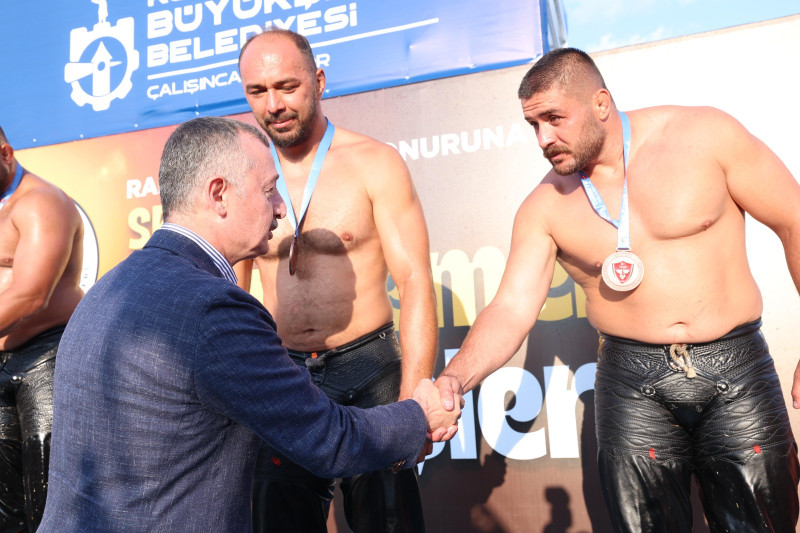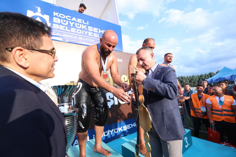 Kocaeli Büyükşehir Belediye Başkanı Tahir Büyükakın, 17. Sekapark Altın Kemer Yağlı Güreşleri’nde rakibi Mustafa Taş’ı yenerek başpehlivan olan Orhan Okulu’ya altın kemerini taktı, tebrik etti.