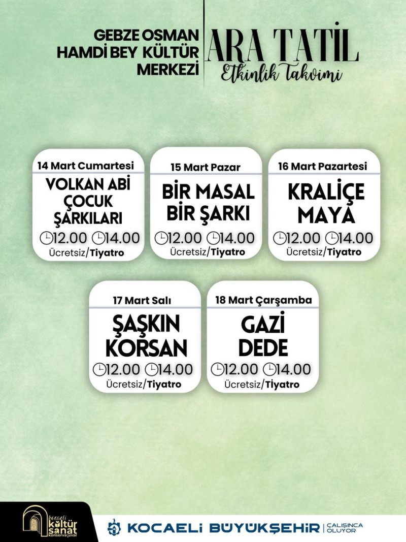Kocaeli Büyükşehir’in ara tatil etkinlikleri iki seans halinde düzenlenecek. Sahne etkinlikleri 14,15, 16, 17 ve 18 Mart tarihlerinde, 12.00-14.00 saatlerinde yapılacak. Atölye çalışmaları ise 17-18 Mart tarihlerinde, 11.00-13.00 saatlerinde gerçekleştirilecek. 18 Mart Çarşamba gününe kadar devam edecek olan ara tatil etkinlik takvimi şöyle: