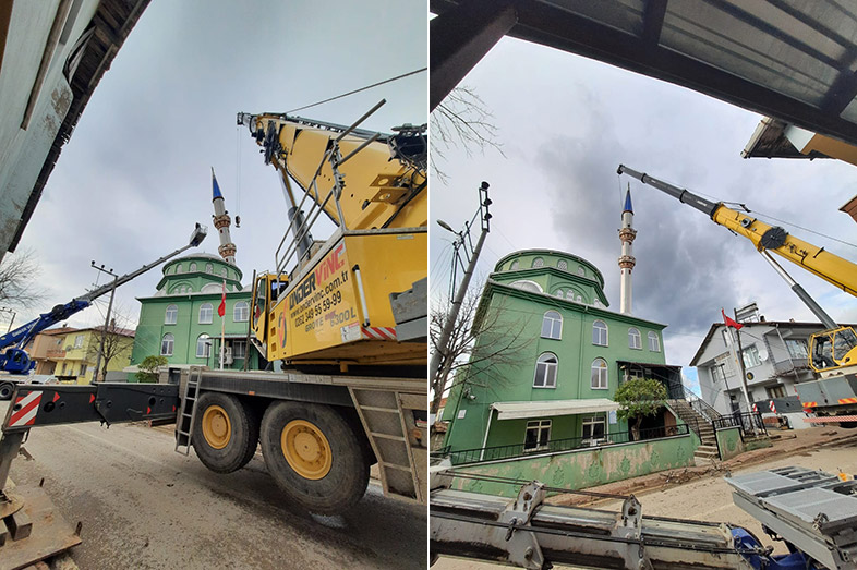 Lodos ve sağanak yağış nedeniyle yan yatan İzmit Arızlı Merkez Camii’nin minaresi, Büyükşehir A Takımı ekiplerince vinç yardımıyla kaldırıldı