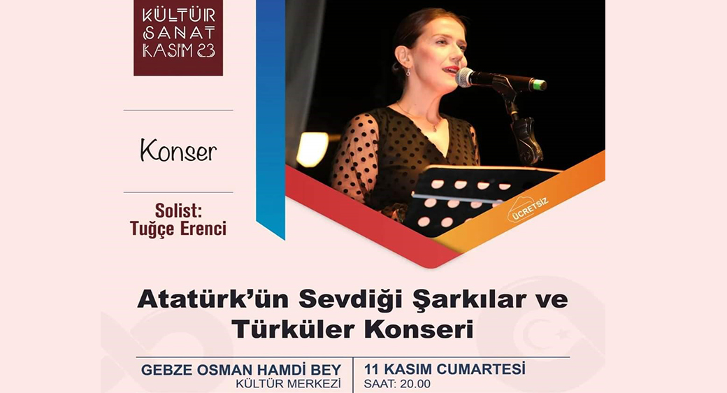 Kocaeli Büyükşehir Belediyesi, Türkiye Cumhuriyeti'nin kurucusu Mustafa Kemal Atatürk'ü vefatının 85. yıldönümünde sevdiği şarkı ve türkülerle anacak. "Atatürk'ün Sevdiği Şarkılar ve Türküler Konseri" Gebze Osman Hamdi Bey Kültür Merkezi'nde 11 Kasım Cumartesi akşamı 20.00'de başlayacak. Konserde, Kocaeli Büyükşehir Belediye Konservatuvarı ses eğitmeni Tuğçe Erenci, Atatürk'ün sevdiği ve zaman zaman kendisinin de okuduğu şarkı ve türkülerden oluşan bir repertuar sunacak. Konsere tüm vatandaşlar ücretsiz katılabilecek.