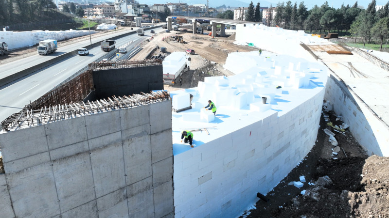 Projede tercih edilen Geofoam dolgu yöntemi sayesinde imalatlar çok daha hızlı ve kontrollü şekilde gerçekleştiriliyor. Hafif yapısı sayesinde zemine binen yükü önemli ölçüde azaltan Geofoam aynı zamanda yapım sürecinin hızlanmasına da katkı sağlıyor. Geleneksel dolgu yöntemlerine kıyasla oldukça hafif olan bu malzeme sayesinde hem yapım süreci hız kazanıyor hem de yapı güvenliği açısından daha kontrollü bir imalat gerçekleştiriliyor.