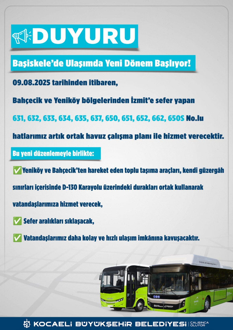Kocaeli Büyükşehir Belediyesi, Başiskele’de toplu ulaşım hizmetlerinde önemli bir dönüşümü hayata geçiriyor. 09 Ağustos (yarın) itibariyle Bahçecik ve Yeniköy bölgelerinden İzmit’e sefer yapan 631, 632, 633, 634, 635, 637, 650, 651, 652, 662 ve 650S numaralı özel halk otobüsleri ile UlaşımPark A.Ş.’ye bağlı otobüsler, ortak havuz sistemiyle hizmet vermeye başlayacak.
