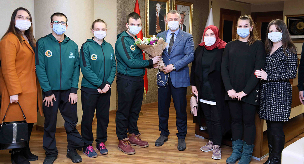 Başkan Büyükakın, Cemil Meriç Engelsiz Yaşam Merkezi’nde eğitim gören ve Engelli Kamu Personel Seçme Sınavı’na (E-KPSS) hazırlanarak dereceye giren öğrencileri makamında konuk etti