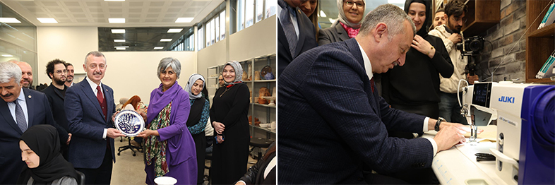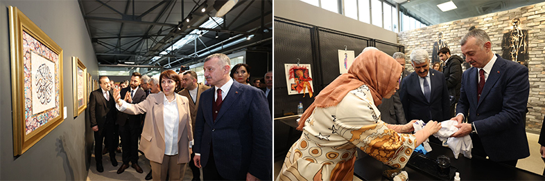Konuşmaların ardından Başkan Büyükakın ve beraberindekiler çadırdan merkezin içine geçerek eğitim alanlarında incelemelerde bulundu. Açılışta sanat merkezinin ilk sergisi sanatseverlerle buluştu. Ebru sanatçısı İlker Selimler ve Sevgi Şen farklı usullerle gerçekleştirdikleri eserlerini sergiledi. Sergide; geleneksel ebru teknikleri ile hazırlanmış eserler, ebru kâğıdının üstüne birden fazla baskı yaparak desen elde edilen Akkase Ebru çalışmaları, ayet ve hadislerle hazırlanan ebru çalışmaları yer aldı. Sanatla estetiğin uyumuyla şekillenen toplam 70 eser alanda sergilendi.