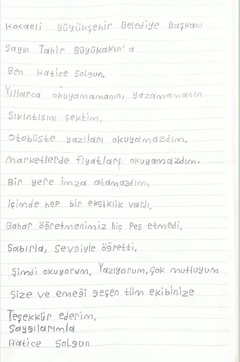 Kocaeli Büyükşehir Belediyesi Meslek ve Sanat Eğitimi Kurslarında okuma-yazma kursu eğitimi alan ve kursu başarı ile bitiren 51 yaşındaki Hatice Solgun, hayatından ilk kez kaleme aldığı mektubunda Kocaeli Büyükşehir Belediye Başkanı Doç.Dr.Tahir Büyükakın’a teşekkür etti.