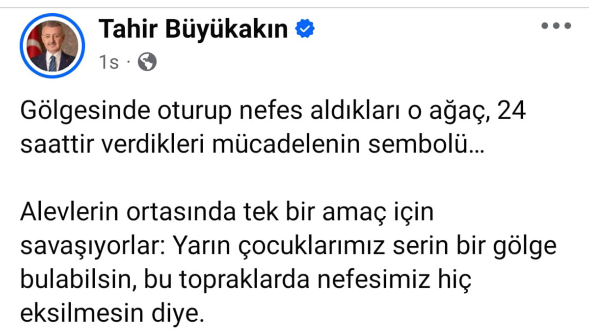 Gölgesinde oturup nefes aldıkları o ağaç, 24 saattir verdikleri mücadelenin sembolü... Alevlerin ortasında tek bir amaç için savaşıyorlar: Yarın çocuklarımız serin bir gölge bulabilsin, bu topraklarda nefesimiz hiç eksilmesin diye. Bu topraklar, onların alın teriyle, cesaretiyle ayakta kalıyor. Bu kahraman kardeşlerimize ne kadar teşekkür etsek azdır. Allah yardımcıları olsun." Başkan Tahir Büyükakın'ın paylaştığı fotoğraf sosyal medyada büyük ilgi gördü.