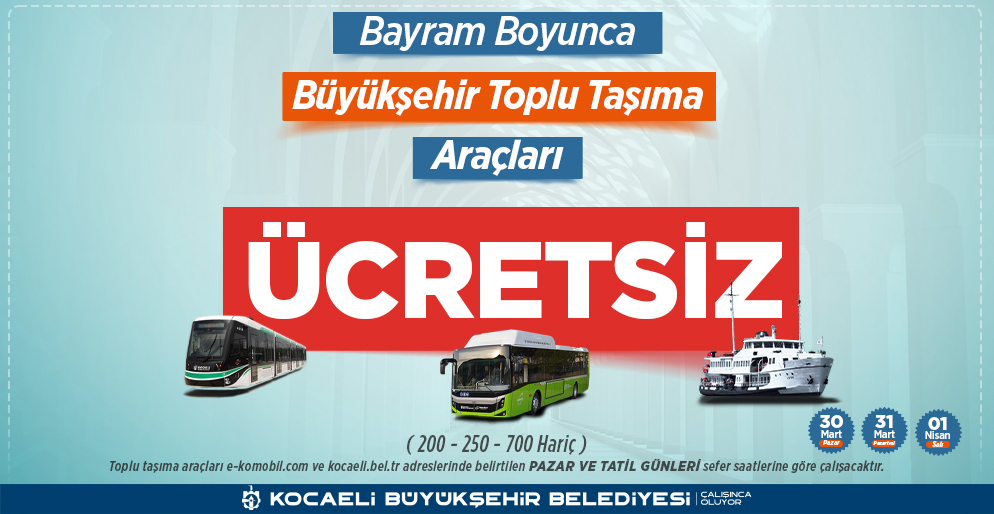Ücretsiz ulaşım Ramazan Bayramı süresince deniz ulaşımı, belediye otobüsleri ve tramvay için geçerli olacak. Toplu taşıma araçları e-komobil ve kocaeli.bel.tr adreslerinde belirtilen pazar tatil sefer saatlerine göre çalışacak.