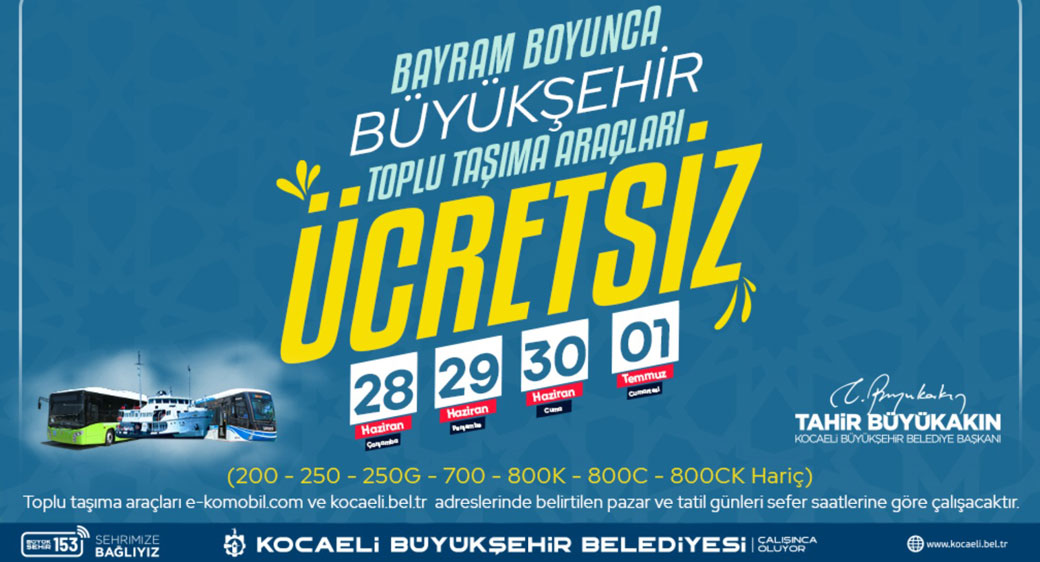 Ücretsiz ulaşım Kurban Bayramı süresince deniz ulaşımı, belediye otobüsleri ve tramvay için geçerli olacak. Toplu taşıma araçları, Eko-mobil ve kocaeli.bel.tr adreslerinde belirtilen pazar tatil sefer saatlerine göre çalışacak.