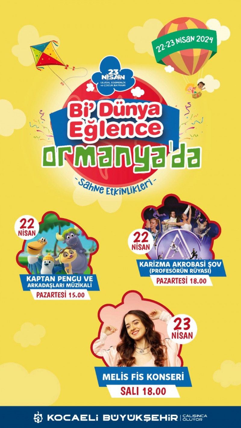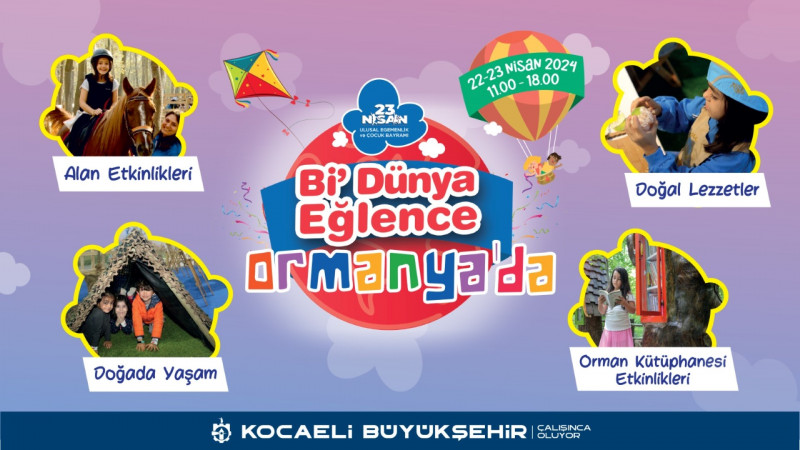 Kocaeli Büyükşehir Belediyesi, 23 Nisan Ulusal Egemenlik ve Çocuk Bayramı etkinlikleri kapsamında bu yıl da çocukları “Bi Dünya Eğlence”ye davet ediyor. Ormanya’nın ev sahipliğindeki etkinlikler 22-23 Nisan tarihlerinde yapılacak. Çocuklar için Ormanya’da çevre ve doğa bilincine yönelik birbirinden renkli eğlence atölyeleri kuruldu. Kocaelili çocuklar iki gün boyunca atölye etkinliklerinin yanı sıra düzenlenecek konser ve sahne şovlarında 23 Nisan coşkusunu yaşayacak.
