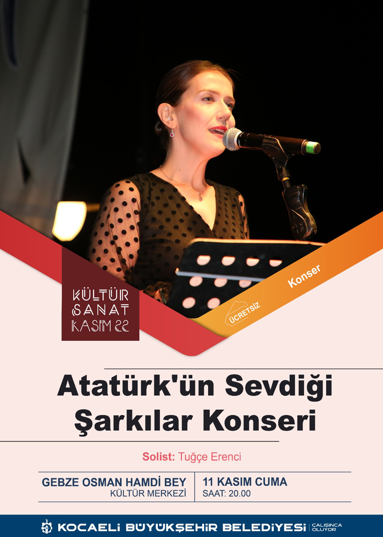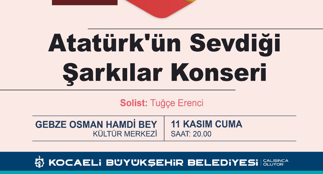 Kocaeli Büyükşehir Belediyesi, Türkiye Cumhuriyeti’nin kurucusu büyük önder Mustafa Kemal Atatürk’ü, vefatının 84. yıldönümünde sevdiği şarkılarla anacak. “Atatürk’ün Sevdiği Şarkılar” konseri Gebze Osman Bey Kültür Merkezi’nde 11 Kasım Cuma akşamı 20.00’de gerçekleştirilecek. Konserde, KBB Konservatuvarı Ses Eğitmeni Tuğçe Erenci, Atatürk’ün en sevdiği şarkılardan oluşan bir repertuar seslendirecek. Ücretsiz konsere tüm vatandaşlar katılabilecek.