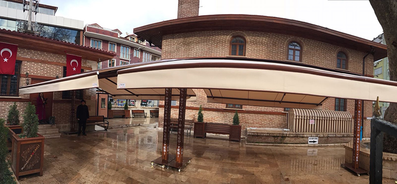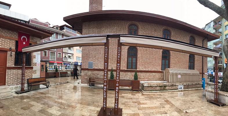Büyükşehir, İzmit Çınarlı Camii’nin bahçesine, vatandaşların ibadet ederken olumsuz hava şartlarından etkilenmemesi için açılır kapanır pergola sistemi kurdu