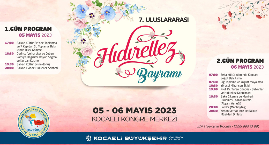 Büyükşehir Belediyesi ile Balkan Türkleri Kültür ve Dayanışma Derneği ile ortaklaşa düzenlenecek olan 7. Uluslararası Hıdırellez Bayramı, 05-06 Mayıs tarihlerinde gerçekleştirilecek. Bayramın birinci günü 17.00’de Seka alanı içindeki Balkan Kültür Evi’nde bir araya gelinerek, yedi kapıdan su toplanacak. Toplanan sular bakır içine konulacak ve bakır gömme ritüeli gerçekleştirilecek. Ardından Derince’ye hareket edilerek burada Çoban Vardiya Değişimi, Koyun Sağma gelenekleri gerçekleştirilecek ve kurban kesilecek. Hıdırellez heyeti etkinliklerin ardından Balkan Evi’ne dönerek, 20.00’de başlayacak Hıdırellez Sohbetine katılacak.
