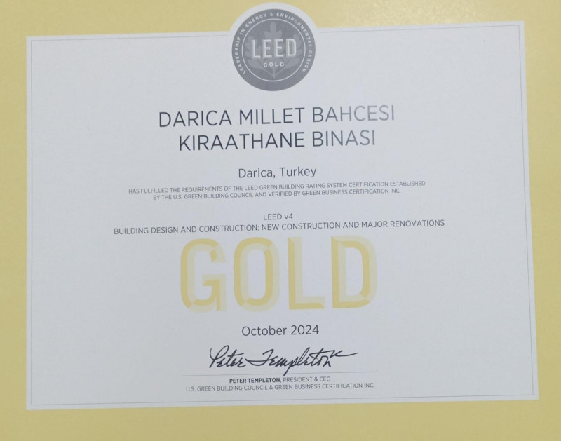 Kocaeli Büyükşehir Belediyesi’nin Darıca ve Çayırova Millet Bahçesi’nde inşa ettiği kütüphane binaları, restoran ve kafeler; çevreye duyarlı tasarımı, ileri teknolojiye sahip akıllı uygulamalar konusundaki öncü yaklaşımı ve çevresel sürdürülebilirlik misyonu ile başarısını tescil ediyor. Bu bağlamda Büyükşehir Belediyesine, dünyanın en yaygın kullanılan yeşil bina sınıflandırma sistemi olan “LEED” sertifikası almaya hak kazanandı.
