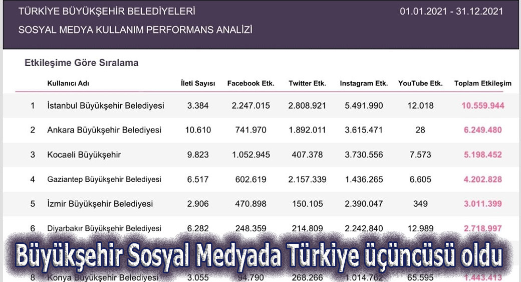 Kurulan Yeni Medya Birimi ile sosyal medyayı etkili kullanan Kocaeli Büyükşehir Belediyesi sosyal mecrada varlığını iyiden iyiye hissettirdi. Buna göre 2021 yılı Türkiye Büyükşehir Belediyeleri Sosyal Medya Kullanım Performans Analizi’ne göre Instagram’da 3 milyon 730 bin 555, Twitter'da 407 bin 378, Facebook’ta 1 milyon 52 bin 945 toplamda ise 5 milyon 198 bin 480 etkileşim sayısıyla kendisine üçüncü sırada yer buldu. İllerin nüfus sayıları dikkate alındığında ise 5 milyonu aşkın etkileşim Kocaeli’nin 2 milyona yaklaşan nüfusunun yaklaşık 2 buçuk katı olması ile de dikkat çekiyor.