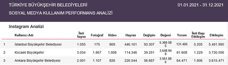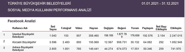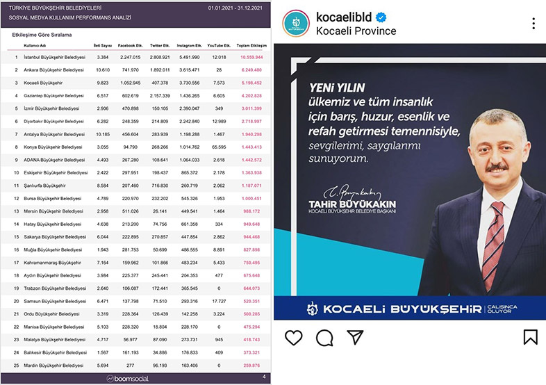 2021 yılı baz alınarak Boom Social tarafından yapılan Sosyal Medya Kullanım Performans Analizi’nde Kocaeli Büyükşehir Belediyesi, Büyükşehir Belediyeleri arasında Facebook ve instagramda Türkiye ikincinci olurken genel performans değerlendirmesinde ise Türkiye'nin 3’üncüsü oldu. Hizmet ve sosyal belediyecilik anlayışıyla hayata geçirdiği projelerle adından sıkça söz ettiren Kocaeli Büyükşehir Belediyesi, Türkiye’ye örnek hizmetlerini geliştirerek dikkatleri üzerinde toplamayı başardı ve bu üstün performansı sosyal medyaya yansıttı. Özellikle Instagram ve Facebook'ta kazandığı yüksek etkileşimle çalışmalarının meyvesini toplayan büyükşehir, bu başarıyı 30 büyükşehir arasında üçüncülükle taçlandırdı.