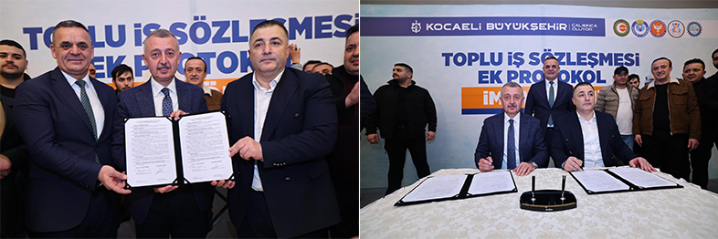 Kocaeli Büyükşehir Belediyesi’nde çalışan 10.500 personeli ilgilendiren toplu iş sözleşmesi imzalandı. Antikkapı Restoran’da gerçekleştirilen imza töreninde Büyükşehir çalışanları, Kocaeli Büyükşehir Belediye Başkanı Tahir Büyükakın’a alkış ve sloganlarla teşekkür etti. Sözleşme, Kocaeli Büyükşehir Belediyesi Başkanı Tahir Büyükakın, Hizmet-İş Sendikası Genel Başkan Yardımcısı İdris Ersoy ve Hizmet-İş Kocaeli Şube Başkanı Muharrem Subaşı tarafından imzalandı.