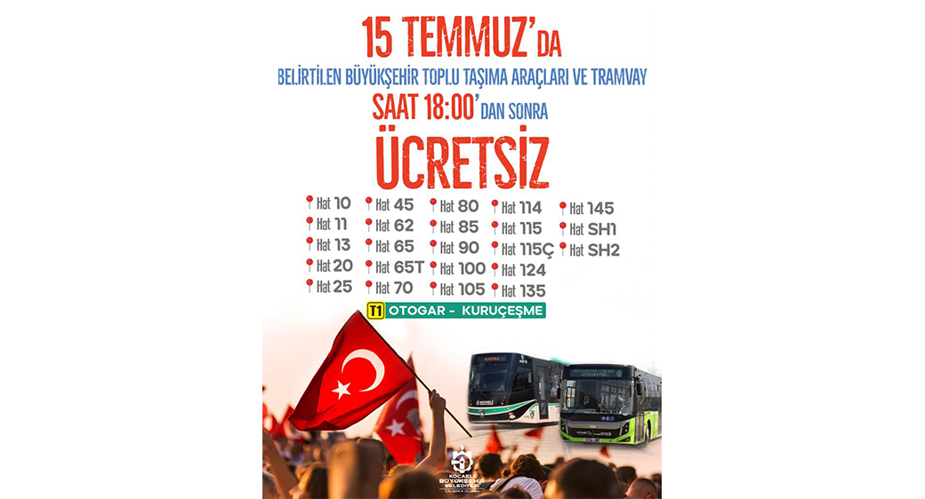 Kocaeli Büyükşehir Belediyesi, 15 Temmuz Demokrasi ve Milli Birlik Günü'nde saat 18.00 itibariyle kendi bünyesine ait belli otobüs hat ve tramvaylarda gece 01.00'a kadar ücretsiz ulaşım hizmeti verecek.