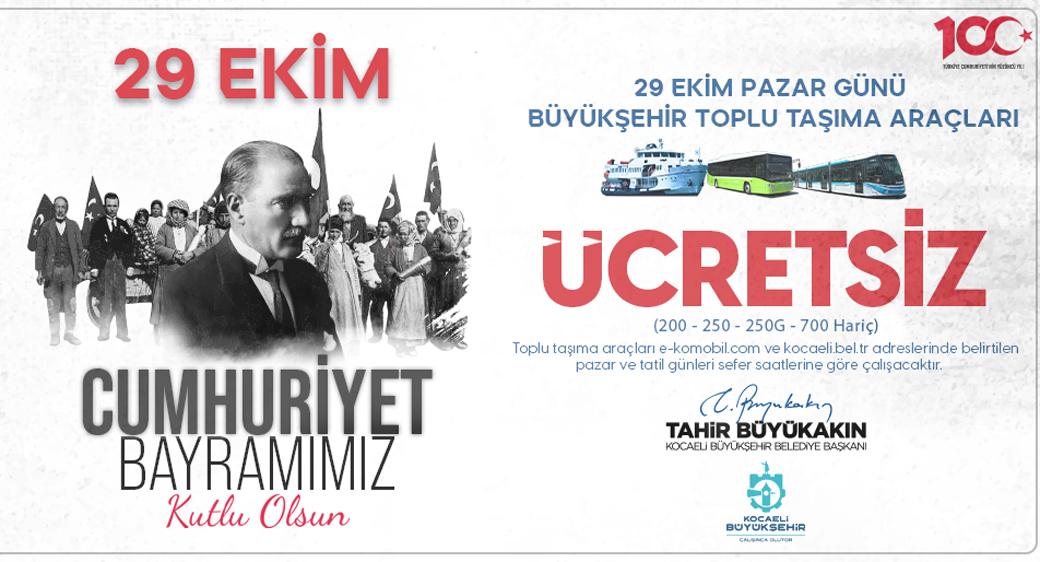 Kocaeli Büyükşehir Belediyesi, 29 Ekim Cumhuriyet Bayramı’nda vatandaşların ulaşımlarını sorunsuz bir şekilde sağlamak amacıyla ücretsiz ulaşım hizmeti verecek. Buna göre vatandaşlar, Kocaeli Büyükşehir Belediyesi’ne ait otobüs, raylı sistemler ve deniz ulaşımından 29 Ekim Pazar günü ücretsiz olarak yararlanacak.