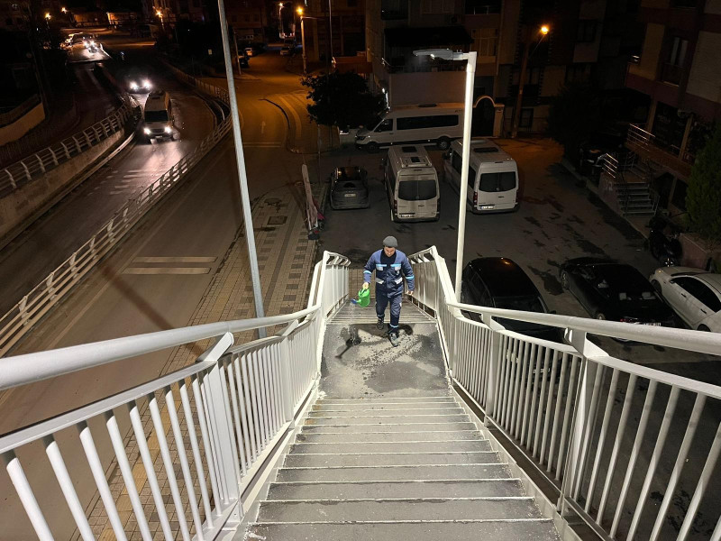 Kocaeli Büyükşehir Belediyesi ekipleri, olası kazaların önüne geçmek amacıyla hastane girişleri, yürüyen merdivenler ve üst geçitlerde solüsyon uygulaması gerçekleştirirken, yaya güvenliğinin sağlanması için yoğun kullanılan kaldırımlar ve durak önlerinde tuzlama çalışmaları da yapıyor. Riskli noktalar titizlikle kontrol edilirken, buzlanmanın etkili olduğu bölgelerde müdahaleler anında gerçekleştiriliyor.