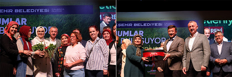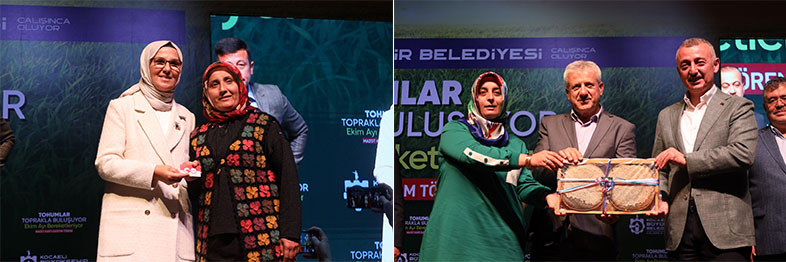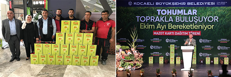 Konuşmaların ardından, Başkan Tahir Büyükakın ve protokol üyeleri, çiftçilere mazot kartı, yem bitkisi tohumu ve modern seralarını teslim etti. Tıbbi ve Aromatik Bitki Yetiştiriciliği Projesi (TABİP) kapsamında Kocaeli’de yetiştirilen biberiye ekstraktı ayçiçeği yağının tanıtımı yapıldı. 18 litrelik yağ, biberiye üretimi yapan bir çiftçiye hediye edildi. Büyükşehir’in tarımsal desteklerinden yaralanan çiftçiler, ürettikleri petek balı, yumurta, çilek, manda yoğurdu ve çeşitli sebze ve meyvelerden oluşan hediyelerini Başkan Büyükakın’a takdim etti. Üreticiler, ilaçlama makineleri, çapa motoru ve diğer tarımsal aletlerinin sergilendiği fuaye alanını gezdi. Davetlilere mancarlı pide ikram edildi.