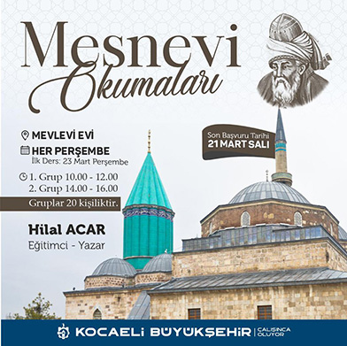 Kocaeli Büyükşehir Belediyesi, Mesnevi Okumaları programı başlatıyor. Okumalarda, Hz. Mevlana’nın önemli eseri Mesnevi-î Şerif’teki manevî öğüt ve tavsiyeler şerh edilerek günümüz Türkçesiyle anlatılacak. Eğitimci-yazar Hilal Acar’ın öncülüğündeki Mesnevi Okumalarının ilki 23 Mart Perşembe günü gerçekleştirilecek. Seka Kültür Alanı içinde yer alan Mevlevi Evi’ndeki okumalar, her hafta perşembe günleri iki grup halinde düzenlenecek. İlk grubun dersleri 10.00-12.00; ikinci grubun dersleri ise 14.00- 16.00 arasında yapılacak. Mesnevi’nin tüm yönleriyle ele alınacağı ve 20 kişilik gruplardan oluşacak dersler için başvuru süresi başladı. Mesnevi Okumalarına katılmak isteyen vatandaşlar, Kocaeli Büyükşehir Belediyesi’nin www.kocaeli.bel.tr adresi üzerindeki linki tıklayarak başvurularını oluşturabilecek.