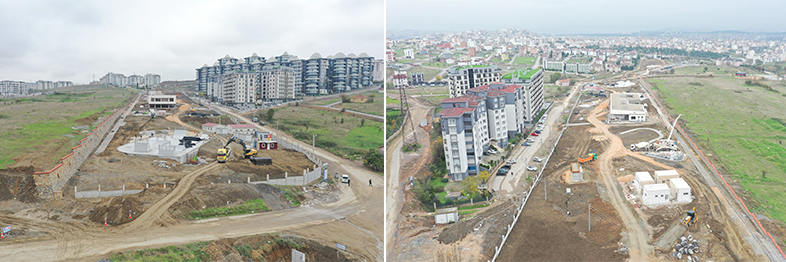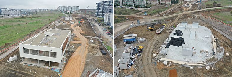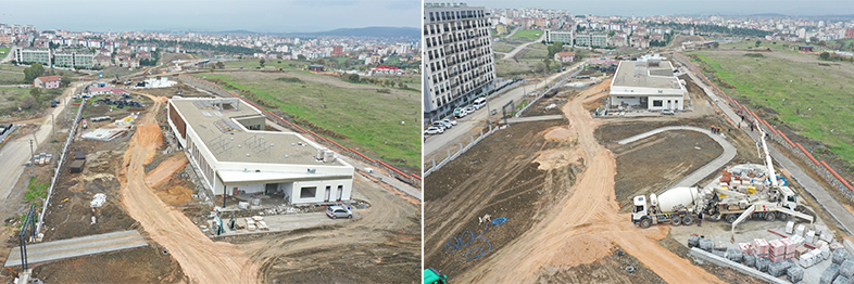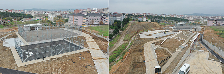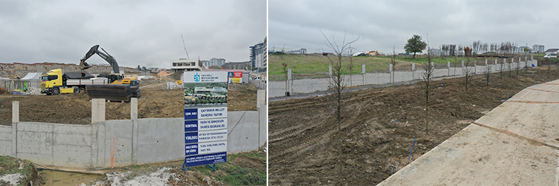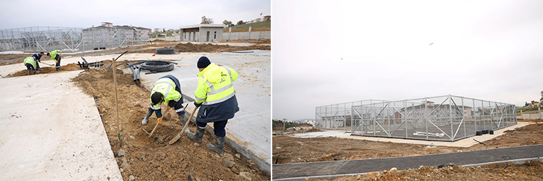 Millet bahçesi çalışmalarına yoğun bir şekilde devam eden Park ve Bahçeler Dairesi Başkanlığı ekipleri, yürüyüş yolları ve bisiklet yolu betonu ve bordür, kıraathane, kafeterya, spor tesisi seramiği ve boya işleri, giriş kapılarının montajları ve mescit, kafeterya, kıraathane, tuvalet, spor tesisi dış cephe kaplamaları devam ediyor.