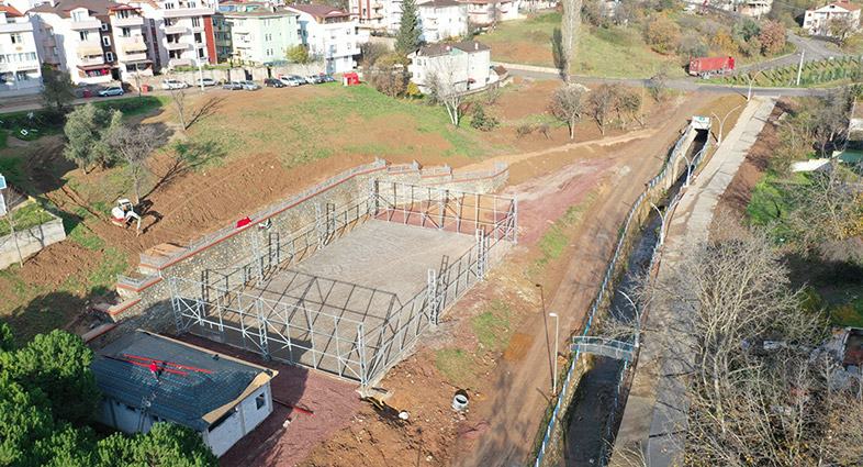Proje kapsamında 21x35 ebadındaki futbol sahasının çelik, drenaj, mıcır dolgu, taş duvar işleri ile çelik imalatları bitirilirken sahanın zemin işlerine devam ediliyor. Kaba inşaat çalışmaları bitirilen sosyal tesis binasının duvar ve çatı imalatlarıyla ince işçilikler yapılıyor.
