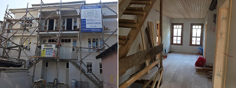 5-6-7 parsel de bulunan yapıda ise pis su ve temiz su tesisatları devam ederken ahşap tavan kaplama detay imalat işleri de başladı. Ahşap tavan zımpara ve boya rötuş işlemlerini de yapan ekipler, sıhhi tesisat, ısıtma tesisatı ve elektrik altyapı işlerini tamamladı. Ahşap döşeme imalatları tamamlanan yapılarda, ahşap tavan kaplama işi de bitirildi. Özgün balkon korkuluğunun korunmuş olanından örnekleme yapılarak eksik olan balkonun korkuluğu yapıldı.