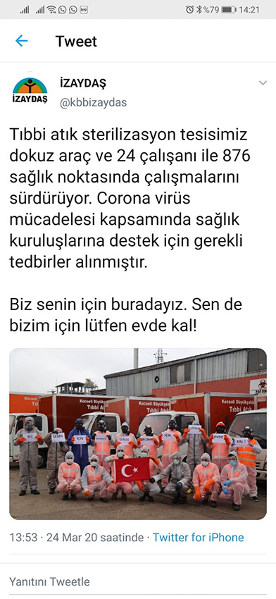Tüm dünyada ve ülkemizde etkili olan koronavirüs (Covid-19) salgınına karşı Kocaeli Büyükşehir Belediyesi, virüsün tüm yönleri ile mücadelesini sürdürüyor. Kocaeli’de koronavirüs tedavilerinin yapıldığı iki devlet hastanesi ve karantina altındaki devlet yurtlarında ortaya çıkan tıbbi atıklar, Büyükşehir Belediyesi iştiraki İZAYDAŞ’ın Tıbbi Atık Sterilizasyon tesisinde bertaraf edilmek üzere özel tıbbi atık araçları ile toplanıyor.