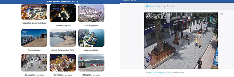 Şehir kameralarını her geçen gün yaygınlaştıran Kocaeli Büyükşehir Belediyesi, ilçelerde bulunan turistik mekânları ve merkezi yerleri, vatandaşların anlık olarak izleyebilmesine imkân sağlıyor. 25 kamera ile hizmet veren Büyükşehir Belediyesi, hem vatandaşların gitmek istedikleri yerler hakkında görüntülü bilgi verirken hem de anlık erişim imkânı sunuyor. Şehir kameralarına Kocaeli Büyükşehir Belediyesi’nin www.kocaeliyiseyret.com adresine tıklayarak ulaşmak mümkün.