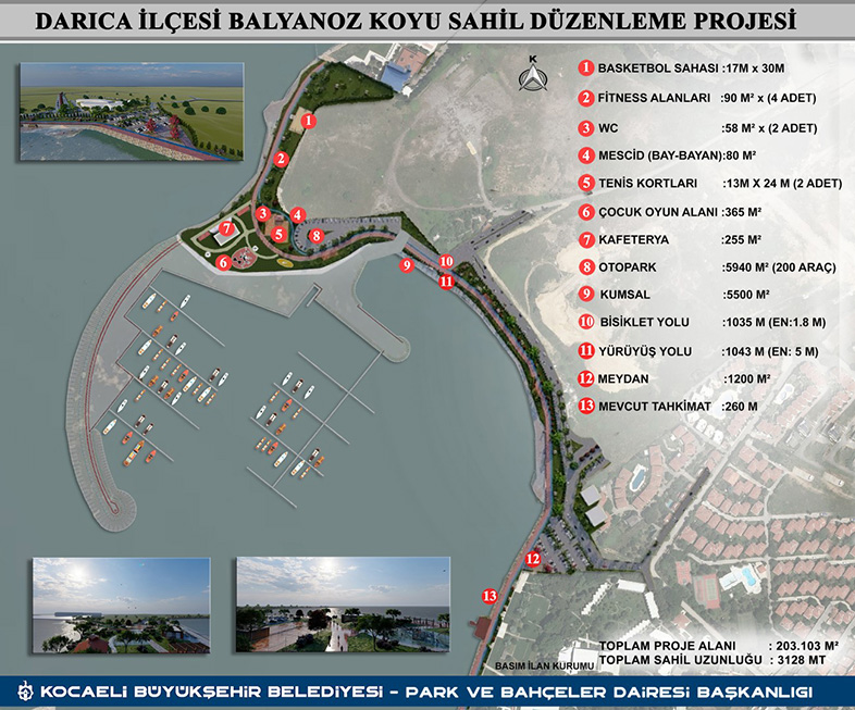 Darıca ilçesi Balyanoz Koyu Sahil Düzenleme Projesi kapsamında sahil parkı içerisinde basketbol sahası, fitness alanları, marina, mescit, tenis kortu, çocuk oyun alanı, kafeterya, otopark, bisiklet ve yürüyüş yolu, meydan gibi sosyal tesis ve mekanlar inşa edilecek.
