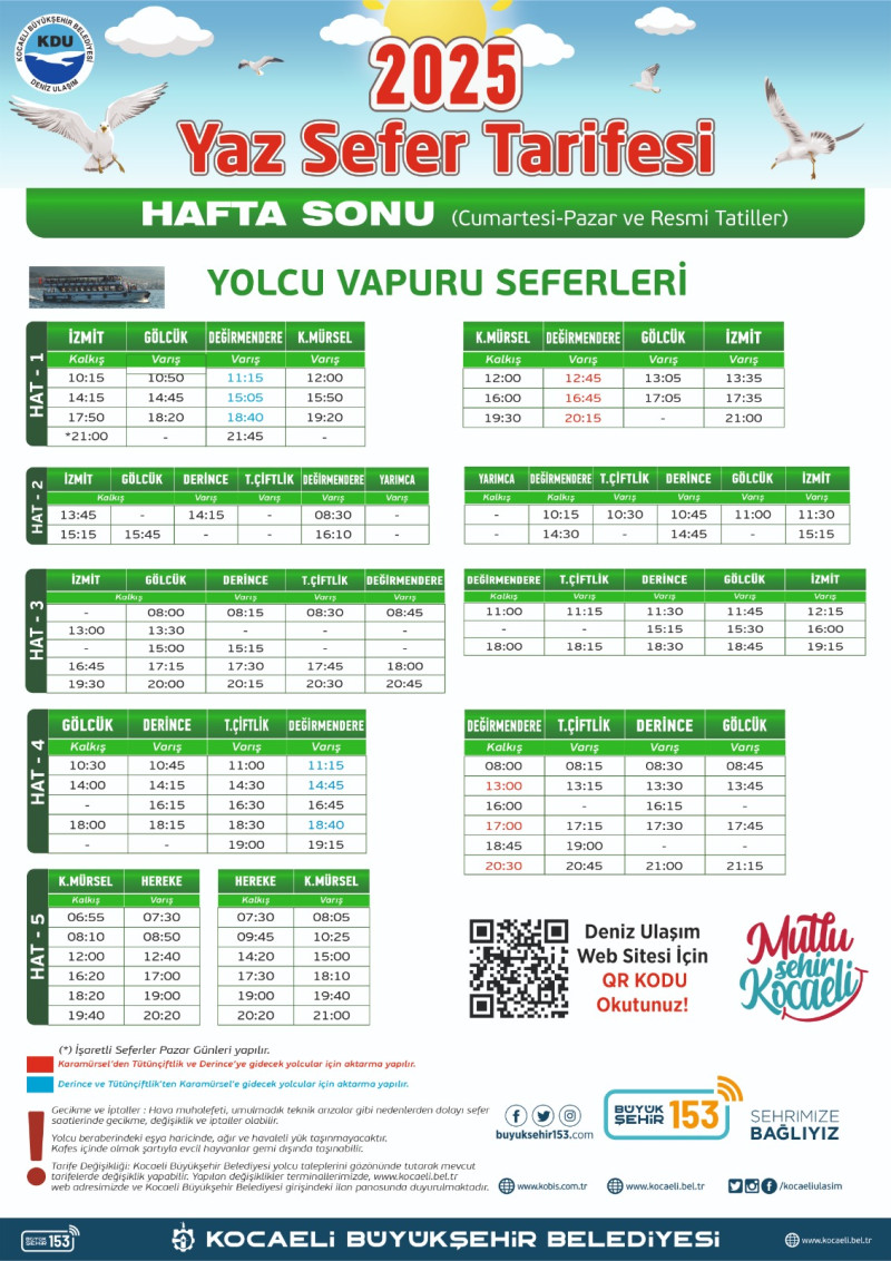 Kocaeli Büyükşehir Belediyesi Ulaşım Dairesi Başkanlığı’na bağlı Deniz Ulaşım Şube Müdürlüğü tarafından uygulanan yolcu vapuru seferlerinde yaz sefer uygulamasına geçiliyor. Buna göre 5 hat ve 9 yolcu iskelesinde her gün 110 seferin yapılacağı yaz sefer tarifesi uygulamasına 30 Haziran Pazartesi günü geçilecek.