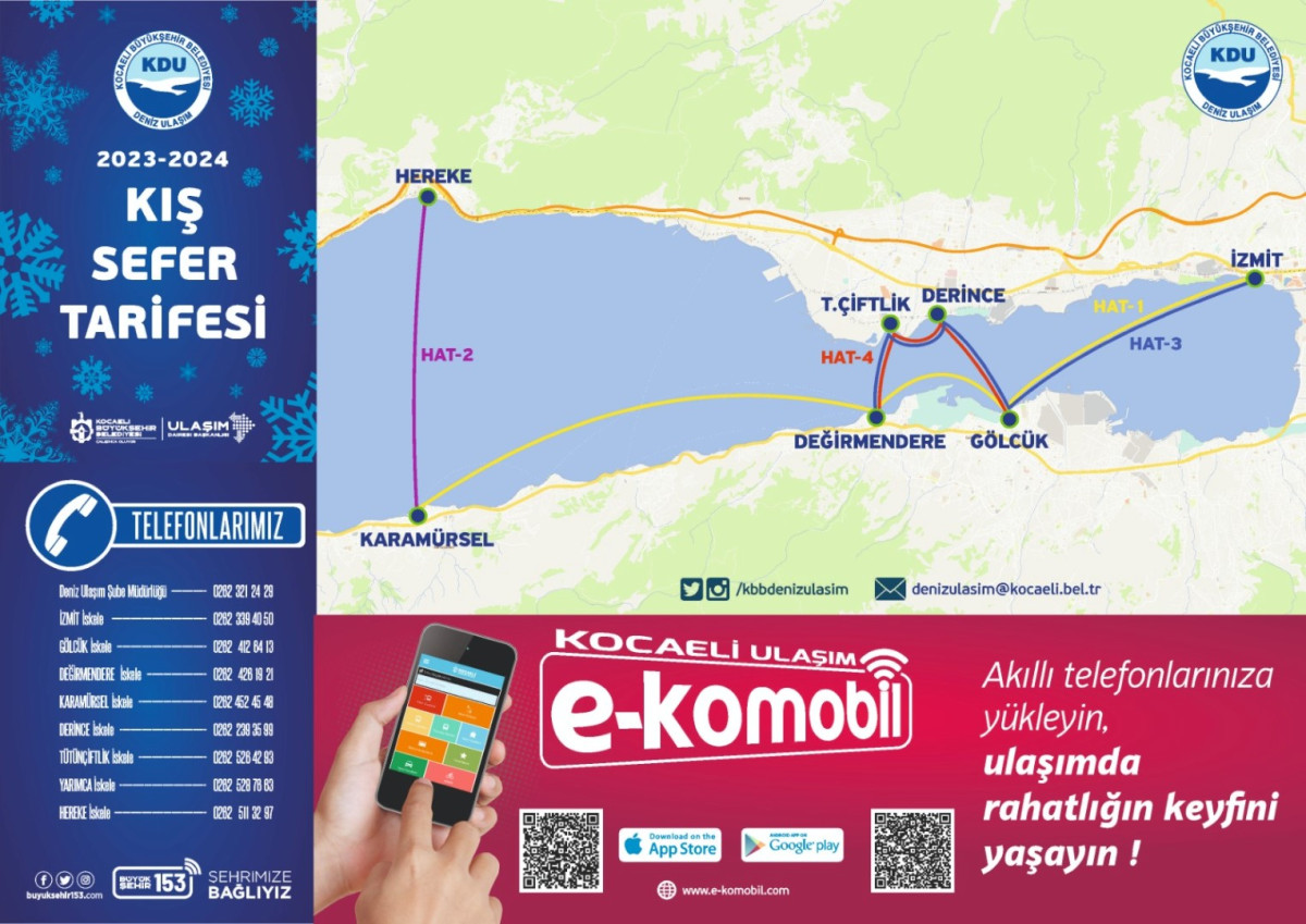 Kocaeli Büyükşehir Belediyesi, deniz ulaşımında Kış Sefer Tarifesine geçiyor. Deniz ulaşımında kış sefer uygulaması 16 Eylül Pazartesi günü başlıyor. Hat 1 İzmit Gölcük, Değirmendere, Karamürsel, Hat 2, Karamürsel – Hereke güzergâhında, Hat 3. İzmit – Gölcük – Derince – T.Çiftlik – Değirmendere güzergâhında ve Hat 4. Gölcük – Derince – T.Çiftlik – Değirmendere arasında gidiş dönüş olarak 16 Eylül 2024 Pazartesi gününden itibaren deniz ulaşımında kış tarifesine geçecek. Deniz ulaşımında kış sefer tarifesi, Kocaeli Büyükşehir Belediyesi’nin www.kocaeli.bel.tr internet sitesinde Vapur Saatleri linkinden, kdu.kocaeli.bel.tr adresinden ve e-komobil üzerinden takip edilebilecek.