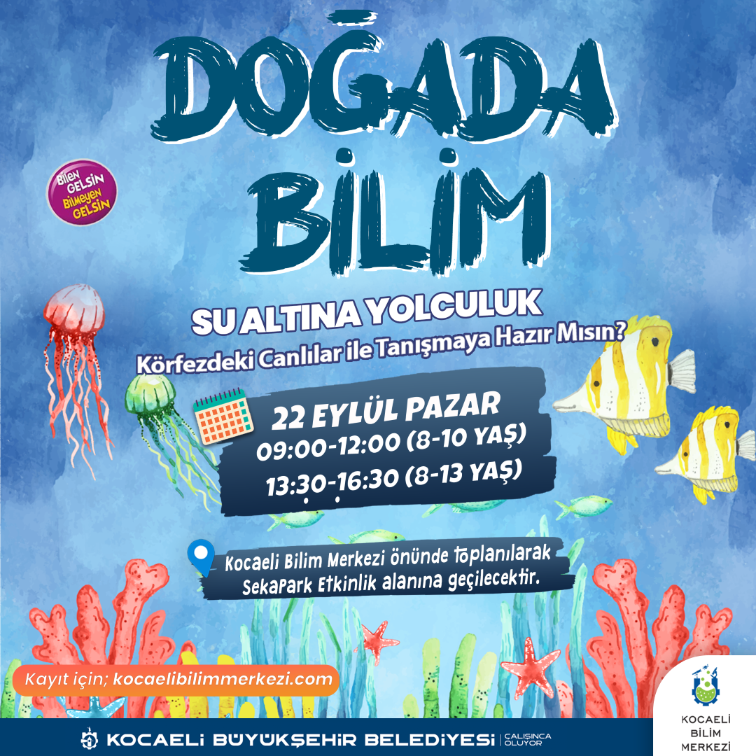 Kocaeli Büyükşehir Belediyesi’ne bağlı Kocaeli Bilim Merkezi tarafından gerçekleştirilecek ''Doğada Bilim/ Su Altına Yolculuk'' etkinliği 22 Eylül Pazar günü SEKA Park alanında yapılacak. Bu etkinliğe katılmak isteyen 8-13 yaş arası çocuklar için kayıt süreci başladı. Başvurular kocaelibilimmerkezi.com adresi üzerinden yapılacak. Etkinlikte su yaşamının, doğal süreçlerin bilimsel bakış açısıyla anlaşılmasını desteklemek amaçlanıyor. Program akışına göre 09.00-12.00 arasında 8-10 yaş arası, 13.30-16.30 saatleri arasında ise 8-13 yaş arası çocuklar etkinliklere katılım sağlayacak. Etkinlikte çocuklar; İzmit Körfezi ile ilgili bilgilendirilecek, Körfezdeki balıkları ve deniz kuşlarını öğrenecek, deniz kıyısı bitki incelemeyle doğal süreçleri gözlemleyecek. Etkinlik, çocukların doğaya ve bilime ilgisini artırmayı ve çevre bilincini geliştirmeyi amaçlıyor. Kocaeli Bilim Merkezi önünde toplanılarak, SEKA park etkinlik alanına geçilecek Doğada Bilim etkinliğine doğayı tanımak isteyen çocuklarımızı bekliyoruz. Kayıtlar kocaelibilimmerkezi.com adresinden yapılabilir.