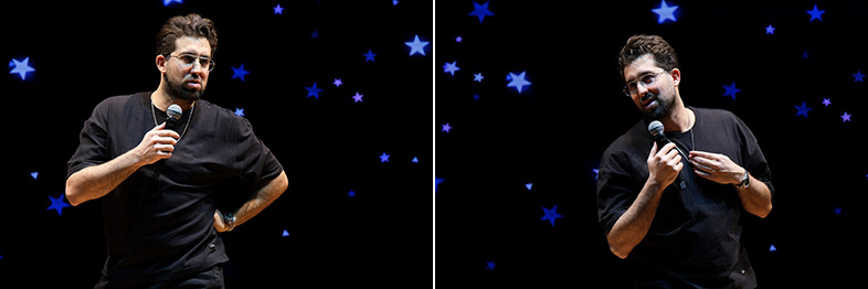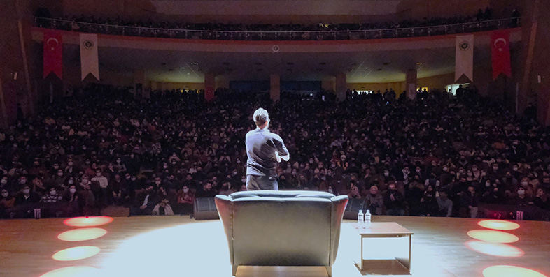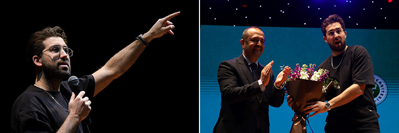 Konuşmanın ardından Doğu Demirkol alkışlar arasında sahneye gelerek gösterisine başladı. Bir saat 15 dakika sahnede kalan Demirkol, gösterisinde kendi hayatından kesitleri esprili örneklerle anlattı. Yönetmen Nuri Bilge Ceylan’ın “Ahlat Ağacı” filminde başrol oynayan Demirkol, sette yaşadığı anılarını da yine kendine has üslubuyla öğrencilerle paylaştı.