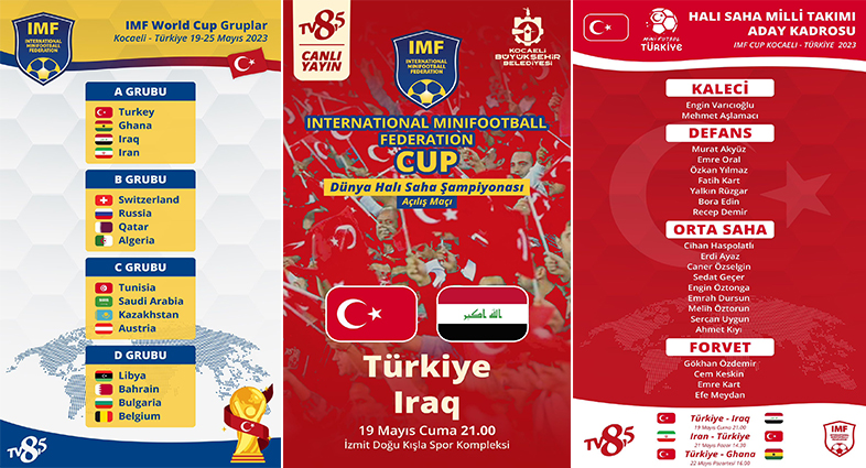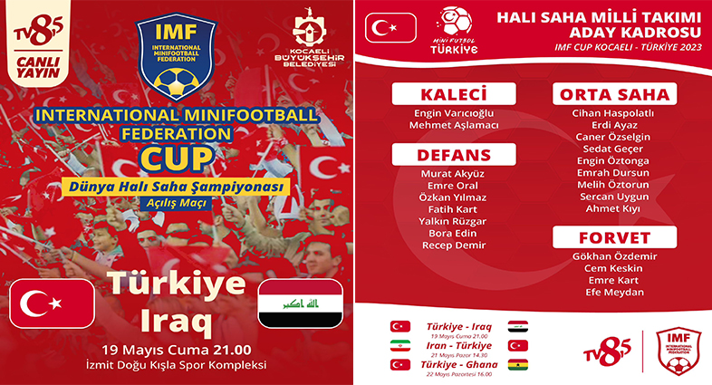 Uluslararası Mini Futbol Federasyonu tarafından Kocaeli’nde düzenlenecek Dünya Halı Saha Mini Futbol Şampiyonası, 19 Mayıs Cuma akşamı İzmit Doğu Kışla Spor Tesisleri’nde start alacak. Turnuvanın açılış maçında ev sahibi Türkiye ile Irak karşılaşacak.