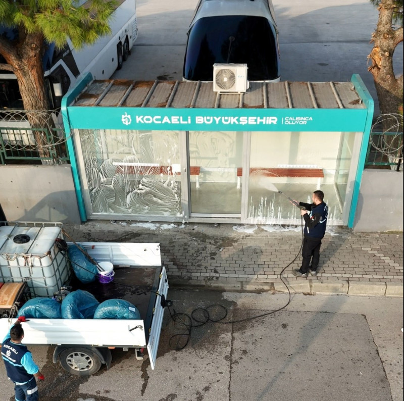 Kocaeli genelinde farklı özelliklere sahip toplam 4 bin 142 adet kapalı yolcu duraklarının temizlikleri ve bakımları ekipler tarafından periyodik olarak yapılıyor. Bu kapsamda Toplu Taşıma Müdürlüğü’ne ait 2 adet durak yıkama aracı ile birlikte günde yaklaşık olarak 50 adet kapalı yolcu durağı yıkanıyor.