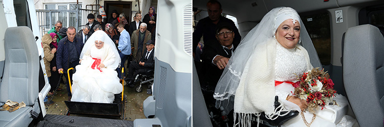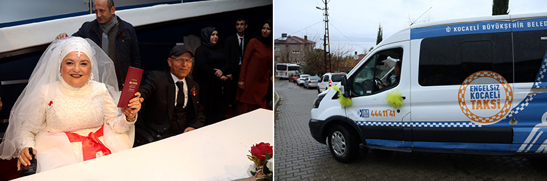Akülü araba tamiri sırasında tanışarak dünya evine giren çifti, Kocaeli Büyükşehir Belediyesi mutlu gününde yalnız bırakmadı. Sağlık ve Sosyal Hizmetler Daire Başkanlığı bünyesinde engelli bireylere hizmet veren Kocaeli Engelsiz Taksi aracı çiftin mutlu günü için süslendi. Damat Halit Dolu Kocaeli Engelsiz Taksi aracı ile birlikte Karamürsel’deki gelin evine gitti. Gelin Necmiye Erdal ve Damat Halit Dolu dualarla Kocaeli Engelsiz Taksi aracına bindi. Gelin ve damat, aile ve akrabalarının eşliğinde oluşturulan konvoy ile Gebze Kültür Merkezi’ne gitti.